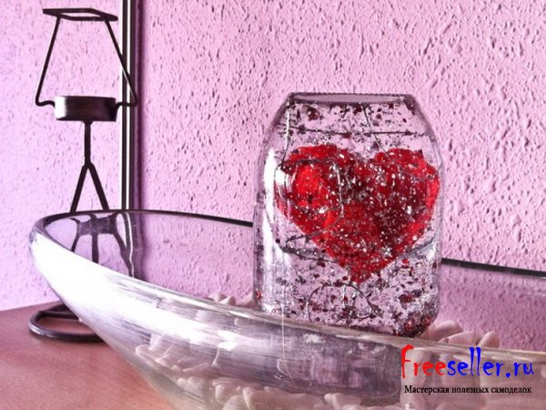 Закройте банку, переверните ее верх дном, положите ее в какую нибудь тарелку или емкость, засыпав крышку мелкими предметами, и преподнесите в день Святого Валентина вашим любимым.