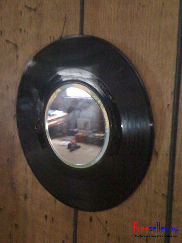 Интересная идея по утилизации старой виниловой пластинки - изготовление из нее настенного зеркала для макияжа.