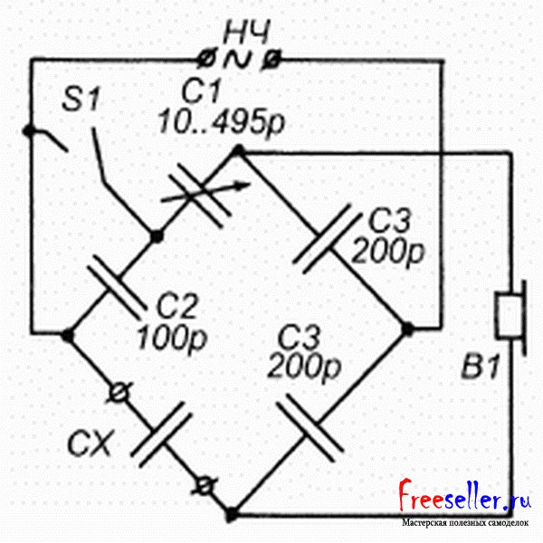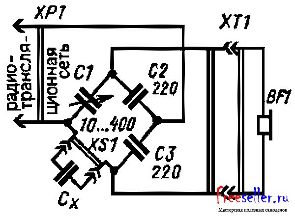Емкость конденсаторов до 300-400 пФ можно определить простейшим измерительным прибором. Это электрический мост, составленный из двух постоянных конденсаторов С2 и С3, конденсатора переменной емкости С1 и измеряемого конденсатора Сх, который подключается через гнезда XS1. Выводы диагоналей моста через разъем ХТ1 соединяются с головными телефонами BF1, а через вилку ХР1 - с линией радиотрансляционной сети.