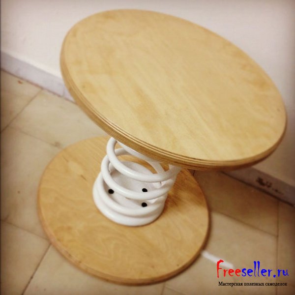 Соединение 2 кругов оснований самодельного журнального столика осуществляется с помощью пружины, которая предварительно красилась в белый цвет.