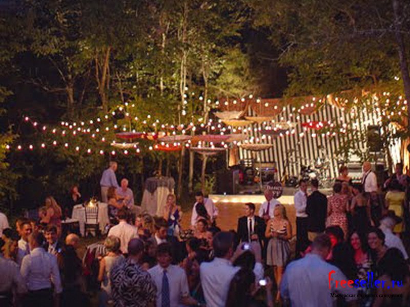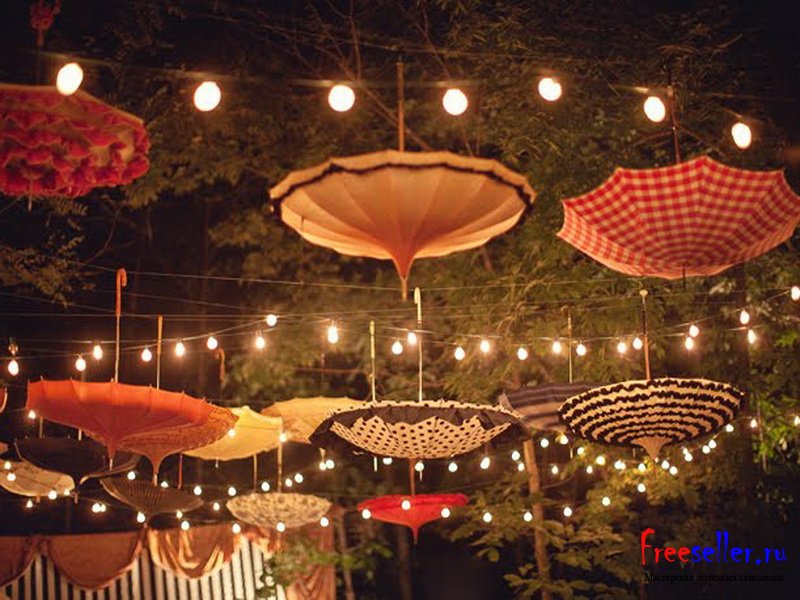 Вся изюминка этого украшения в том, что зонты подвешиваются на проводы с лампочками, которые при свечении создают неповторимую атмосферу праздника, любви и романтики.