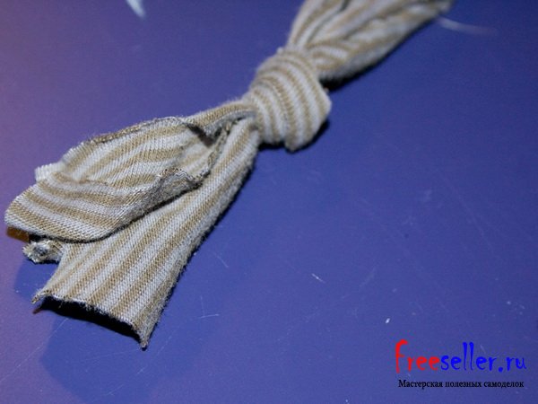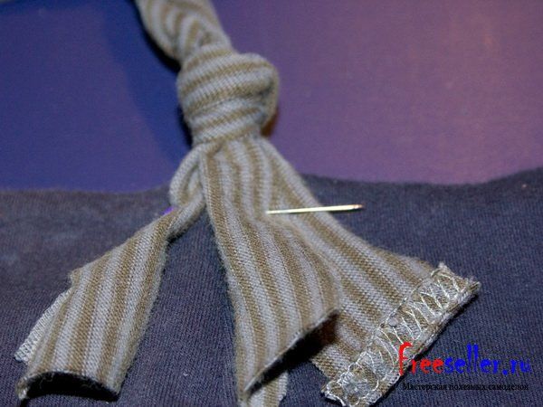 8. Закрепите ручку из полосок ткани с помощью булавки.