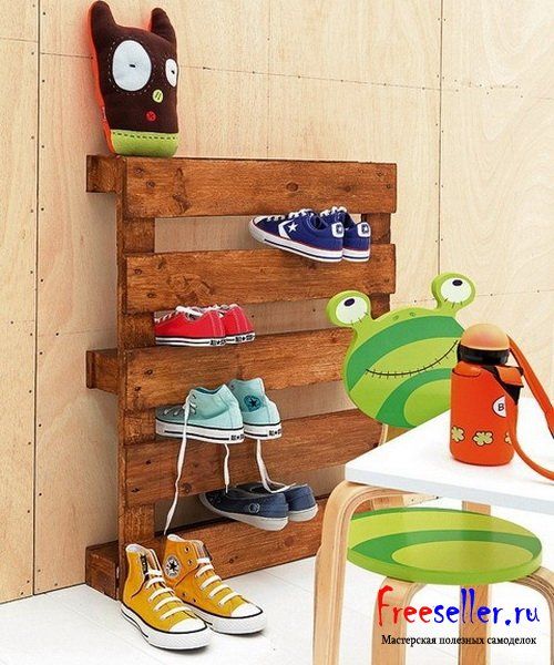 На днях сделали полку для обуви сделана из обычного поддона, который обработали антисептиком и покрыли морилкой.