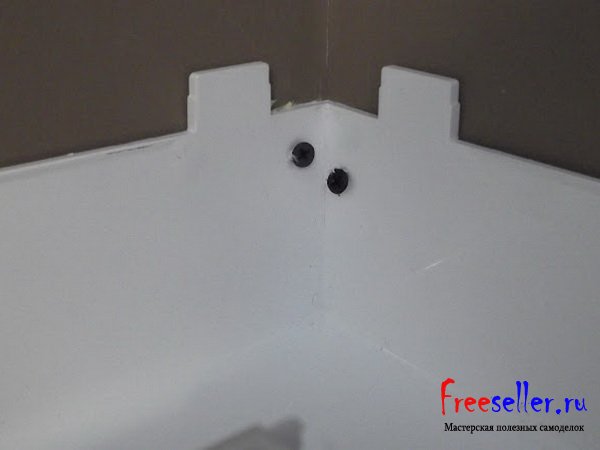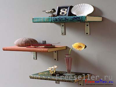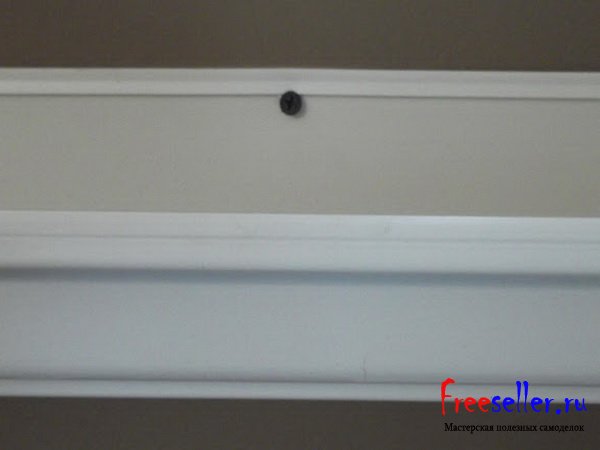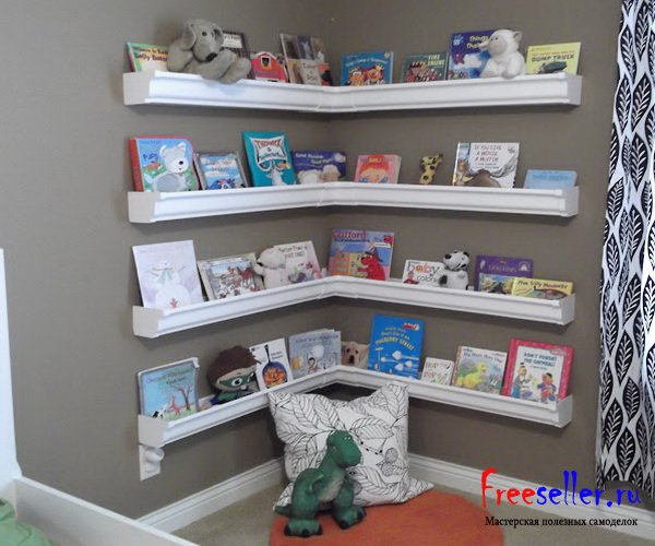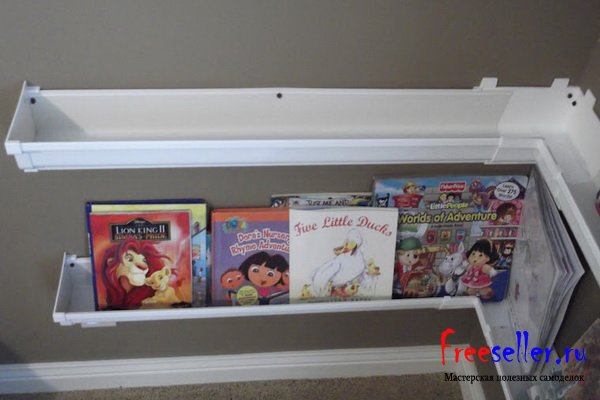 Крепление самодельных книжных полок из водосточных желобов к стене с помощью саморезов для гипсокартона.