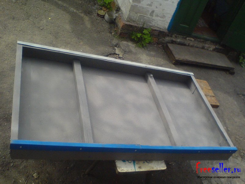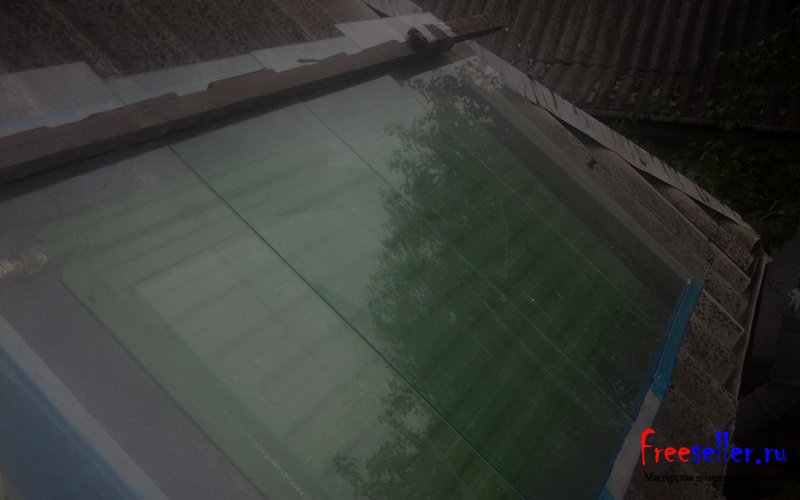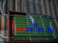 Конструктивно самодельный солнечный коллектор состоит из 2 плоских стальных радиаторов отопления, размещенных в стальных коробах, которые в свою очередь были размещены на крыше дачного дома, и накрыты стеклом.