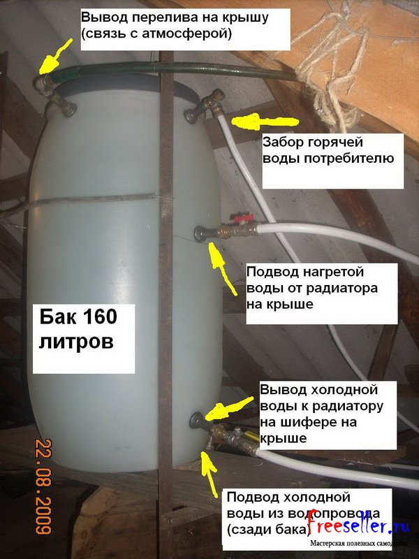 На чердаке дома размещена 160 литровая пластиковая бочка. Бак с помощью металлопластиковых труб и фитингов соединен с радиаторами на крыше и водопроводом в доме.