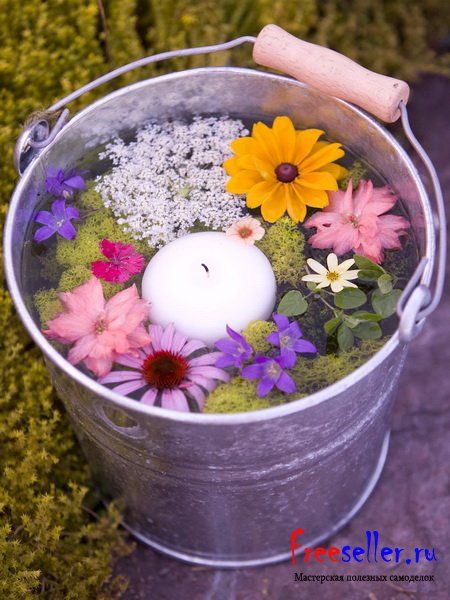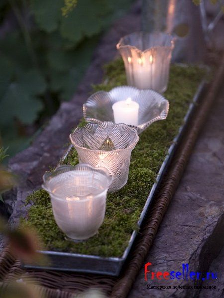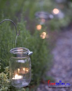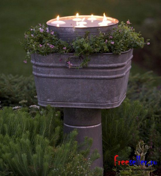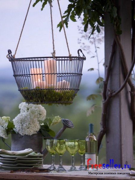 Самодельные подсвечники для украшения сада из подручных средств:стеклянных банок, плафонов от люстр, оцинкованных ведер, корзин, решеток.