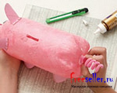 4) С помощью канцелярского ножа проделать отверстие в бутылке для монет. Накрутите на палец проволоку и приклеите его к к копилке.