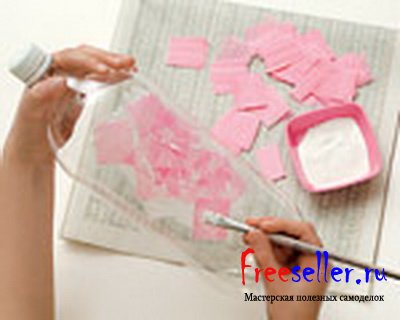 2) Разрежьте цветную бумагу на квадраты, и приклейте их на пластиковую бутылку.
