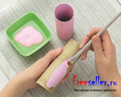 1) Покрасьте картонные трубки от туалетной бумаги розовой акриловой краской, и отложите в сторону для просушки.