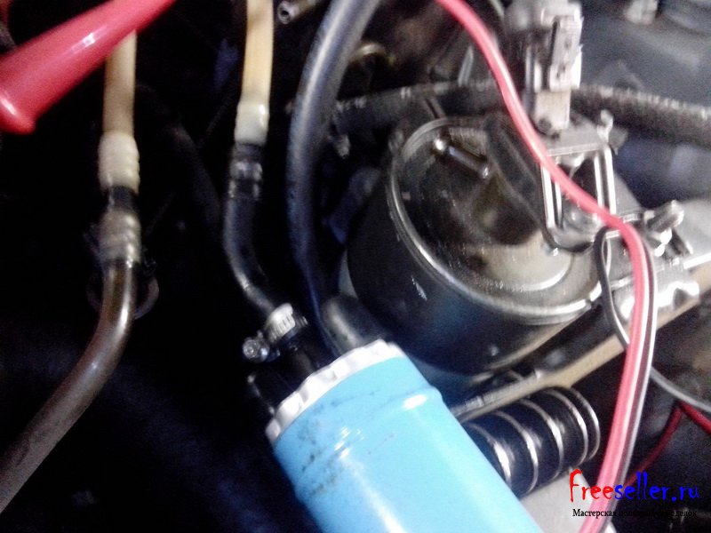 4) Подключаем питание к самодельному насосу (На бмв подключаем к плюсовой клемме на двигателе и массе), ждем пока топливный насос прокачает систему и на топливный фильтр заполниться соляркой.