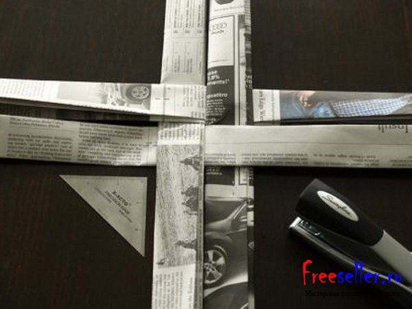 Начните переплетение полосок с центра. Для этого вначале переплетаются 4 полосы, и при необходимости скрепляются меду собой степлером.