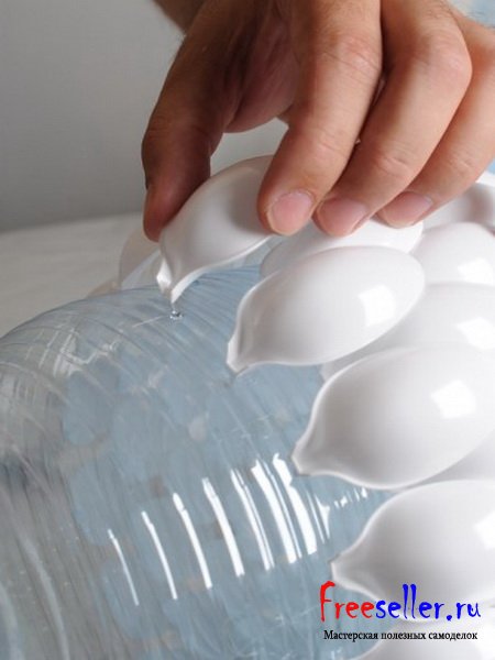 Приклейте обрезанные ложки к 5 литровой пластиковой бутылке. Для этого воспользуйтесь клеевым пистолетом.
