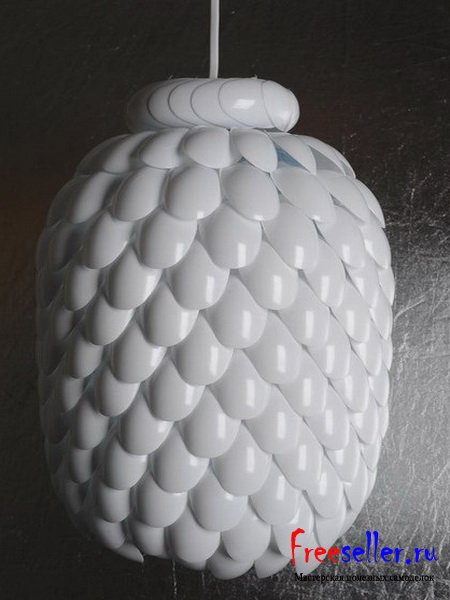 Вот так выглядит готовая дизайнерская люстра из пластиковых ложек.