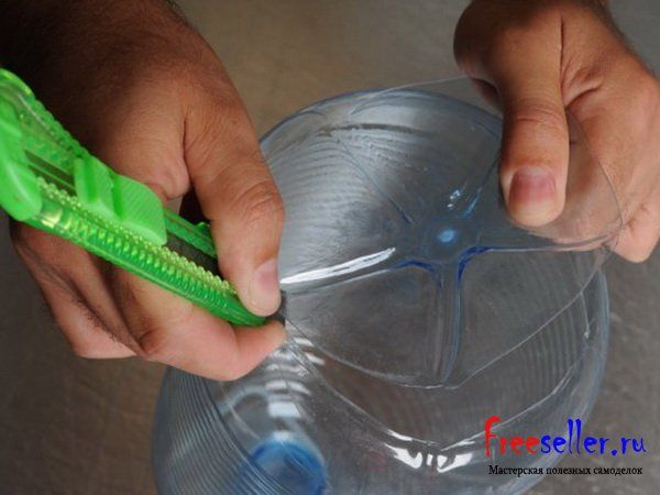 У 5 литровой пластиковой бутылки с помощью канцелярского ножа необходимо вырезать дно.