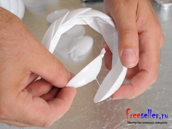 Самодельная люстра из пластиковых бутылок и ложек во время работы.