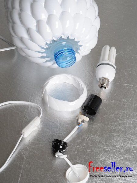 Смонтируйте через горлышко пластиковой бутылки патрон, закройте горлышко бутылки декоративным кольцом, которое изготовили ранее.