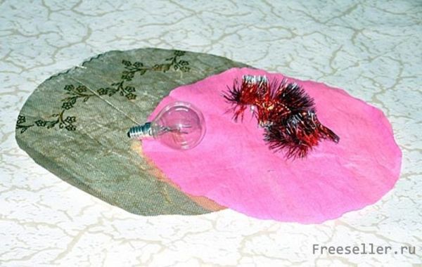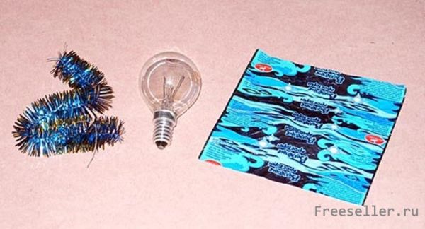 Можно просто обернуть лампочку красивой оберточной бумагой и обмотать ее обычным дождиком.
