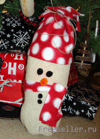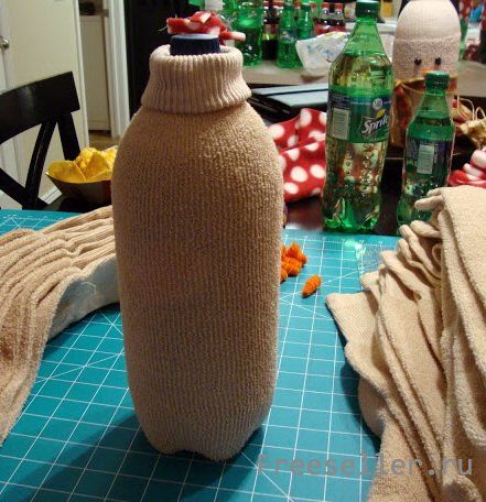 Одеваем носок на бутылку, если нужно, завязываем ниткой у горлышка и отворачиваем края.
