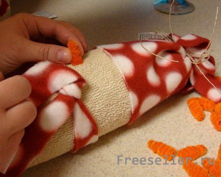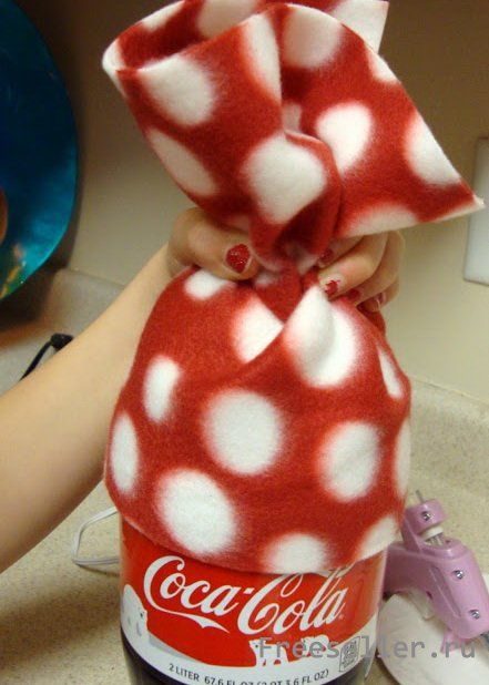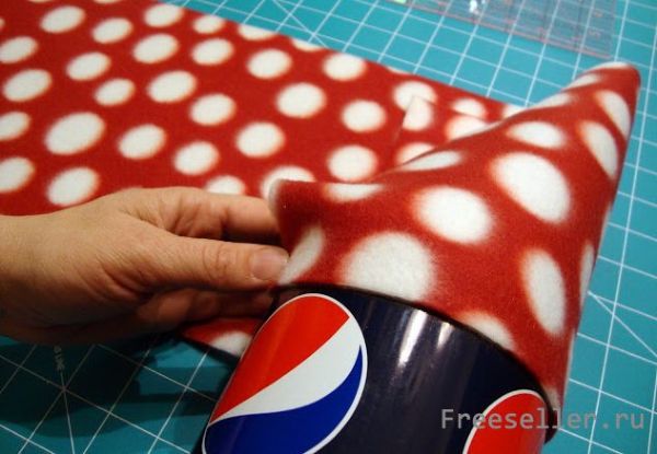 Сначала готовим шапку нашему снеговику. Нужно рассчитать размер лоскута из яркой ткани так, чтобы тканью с запасом обернуть верх бутылки.