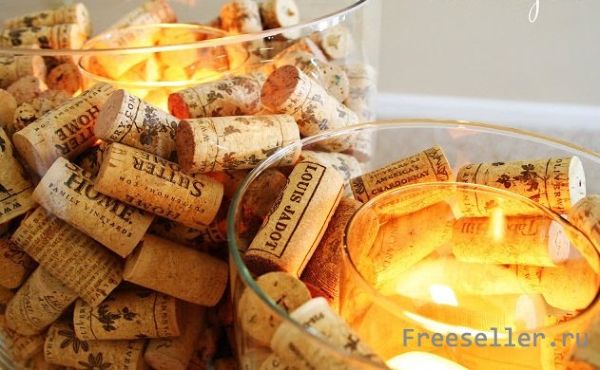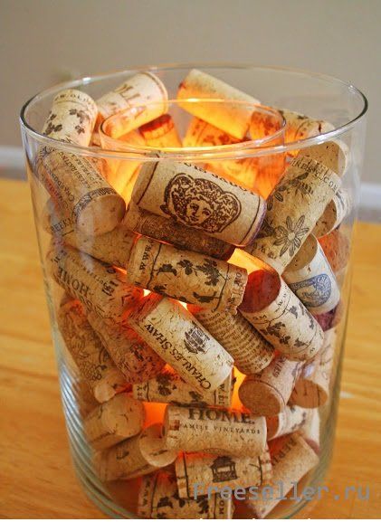 Засыпаем пробки в сосуд большего объема, зажигаем свечу и наслаждаемся гармоничным сочетанием огня, стекла и дерева.