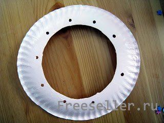 В тарелке вырезаем круг и дыроколом прокалываем вокруг 9 отверстий.