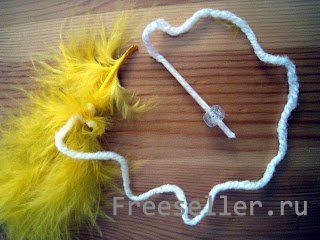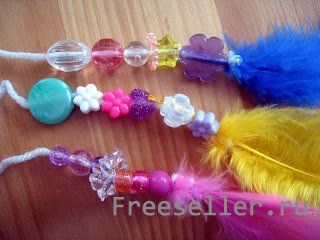 На одном конце шнура закрепляем перо,нанизываем бусины.