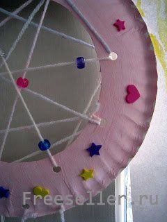 Для того чтобы сделать ловушку для снов для маленьких детей, понадобится одноразовая тарелка из плотного картона, средней толщины шнур, перья, бусины и декоративные фигурки в форме звездочек, сердечек и цветочков.