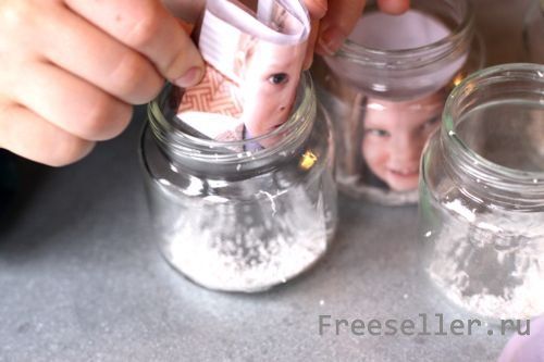 В подготовленную баночку со "снегом" помещаем цилиндр с фотографиями.