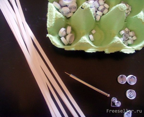 1. Вырежьте полоски из бумаги. Из полосок сделайте свёрнутые в спираль кружки. Кружки сделайте разных размеров. Сделайте сердечки. Чтобы кружки не смешивались, положите их в коробку, например из-под яиц.