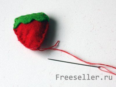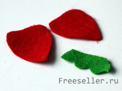 8. Приготовьте украшение для пирожного. Вырежьте из красного фетра заготовки в виде клубники, листьев. Сшейте их вместе, набейте ватой.