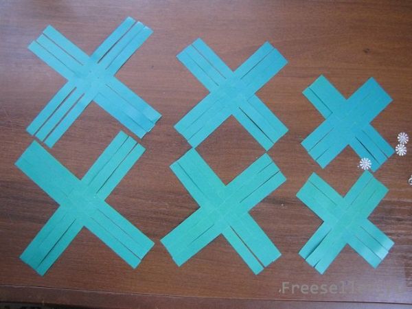 Получившиеся "крестики" попарно соединяем: кладем один элемент на другой, средние полоски заворачиваем внутрь и склеиваем, внешние - склеиваем без заворота.