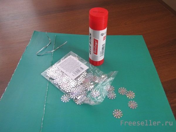 Чтобы сделать такую елочку, понадобится 2 листа цветной бумаги, клей и готовые блестящие украшения в виде мелких снежинок.