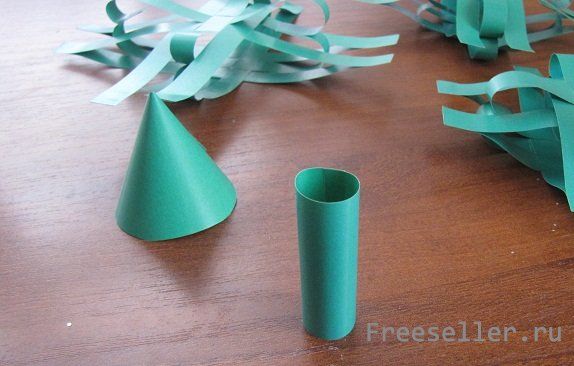Для прочности формы и завершенности нам понадобится верхушка в виде объемного конуса и 3 цилиндра. Конус мы установим на макушке, а цилиндры вклеиваем в серединку каждого из трех получившихся элементов. Они будут выполнять роль ствола