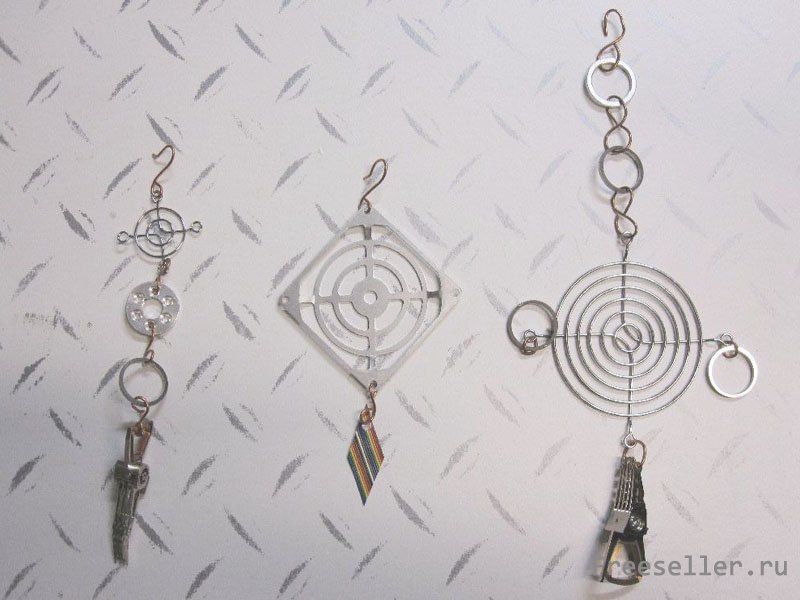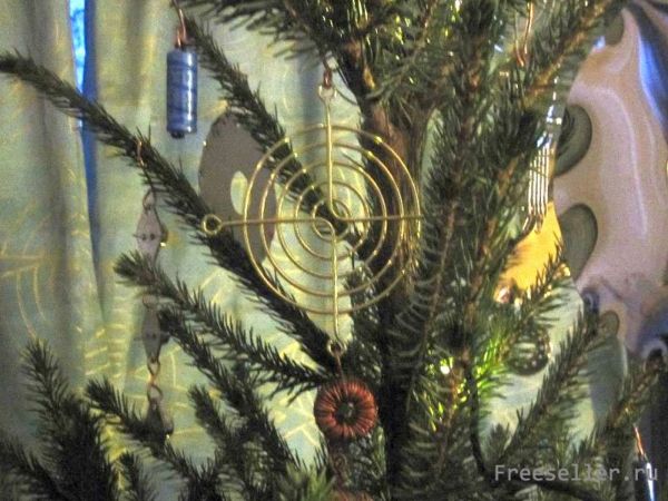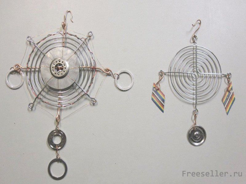 Для изготовления 2-го вида елочных игрушек будем использовать хромированные решетки о вентиляторов, а также различные кольца полученные при разборке жестких дисков, IDE шлейфы, головки чтения проволоку и т.п.