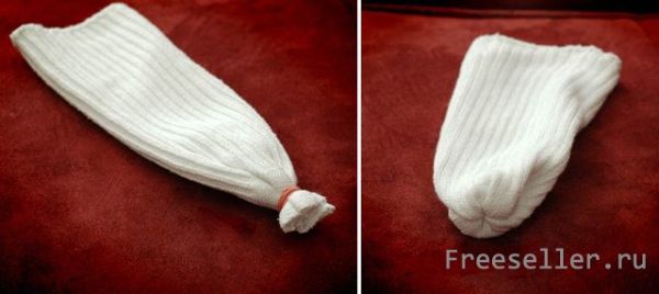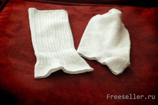 Разрезаем белый носок на половинки. Нам необходима часть, которая с двумя отверстиями. Пяточная часть нами использоваться не будет.