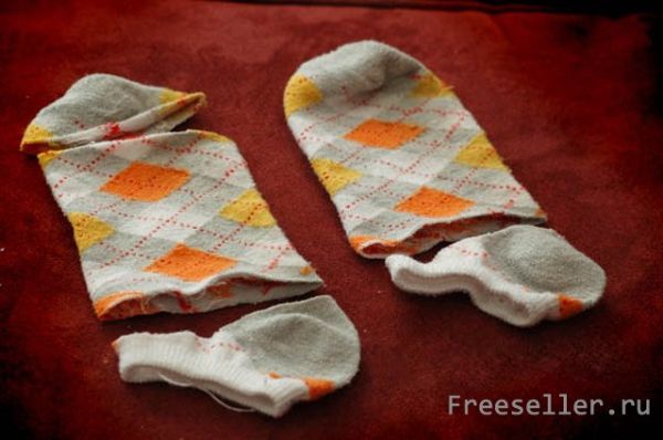 Берем приготовленные носки для декорирования, разрезаем их так, как на фотографии. Среднюю часть от первого носка мы будем использовать для одежды снеговика, а верх второго носка, который был вами отрезан, в будущем превратится в шапку.