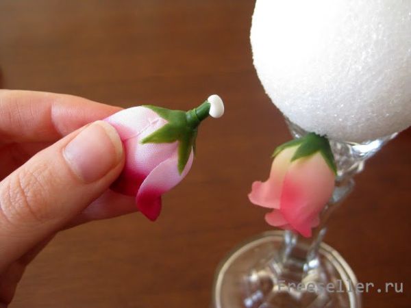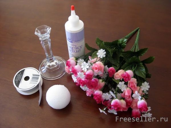Крепим шарик из пенопласта к подсвечнику, можно использовать горячий клей. Аккуратно отделяем бутоны от выбранных искусственных цветов, при этом оставляя часть стебля.