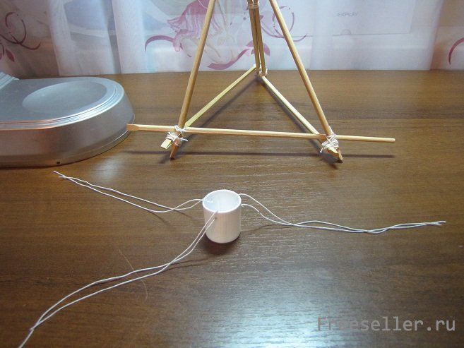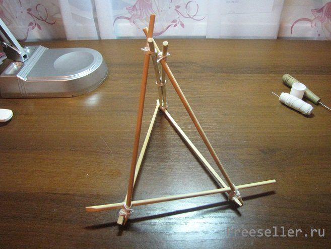 Получившиеся треугольники скрепляем нитью за одну из сторон, а в основании крепим еще оду палочку. Получается такой вот "шалаш".