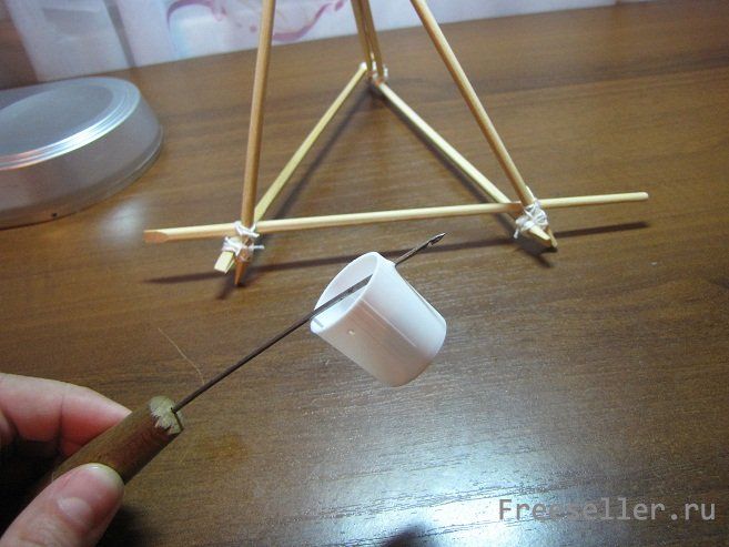 Понадобятся китайские палочки - 7 шт., прочная нить, эластичная нить - "резинка" и колпачок с чего-нибудь или половинка контейнера от киндер-сюрприза.