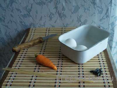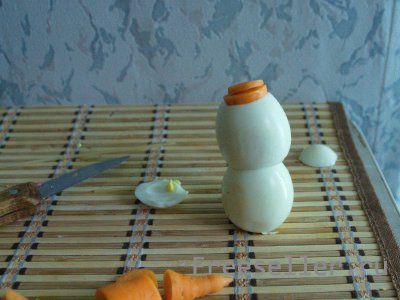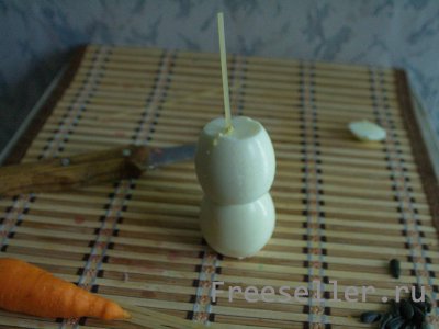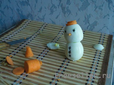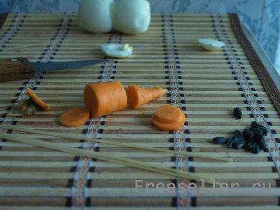 5. Делаем из кончика морковки нос, а из семечек глаза и пуговки.
