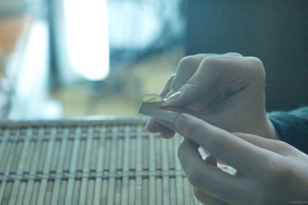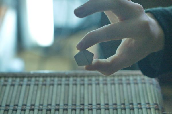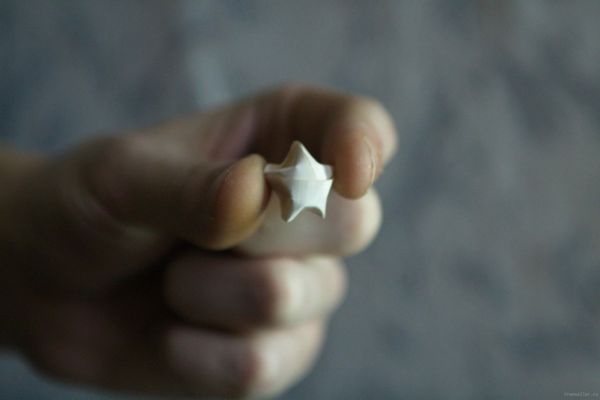 10) Самый важный момент: двумя пальцами одной руки держим наш пятиугольник, а ногтем другой руки надавливаем на одну грань пятиугольника, стараясь попасть в серединку грани. То же самое проделываем и с остальными гранями.