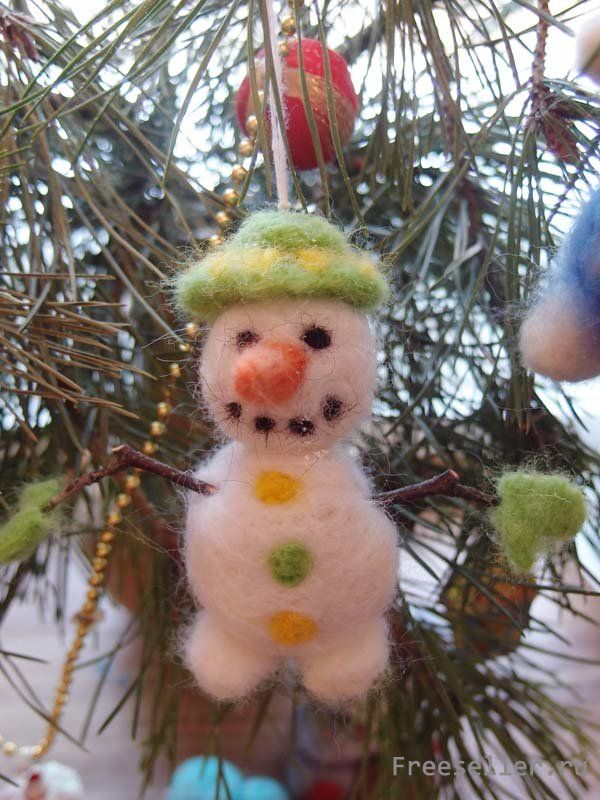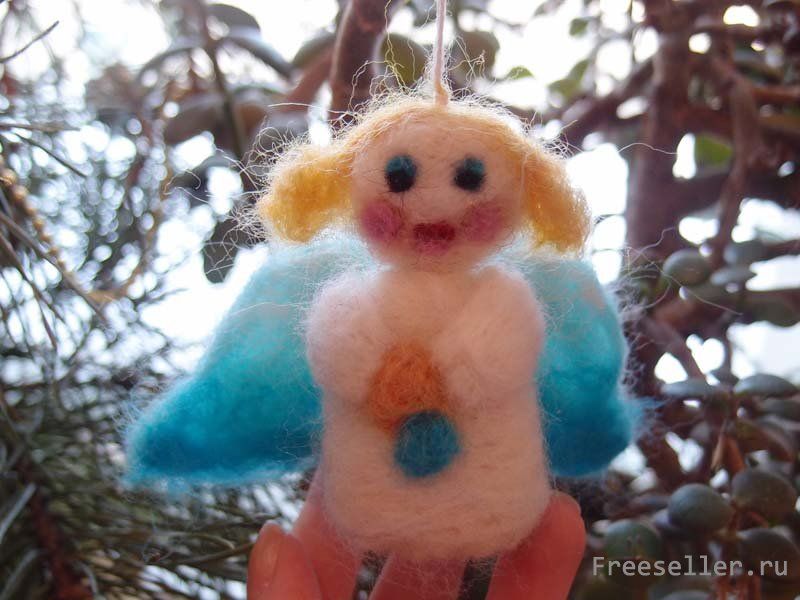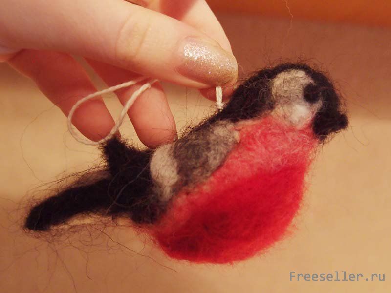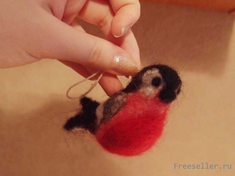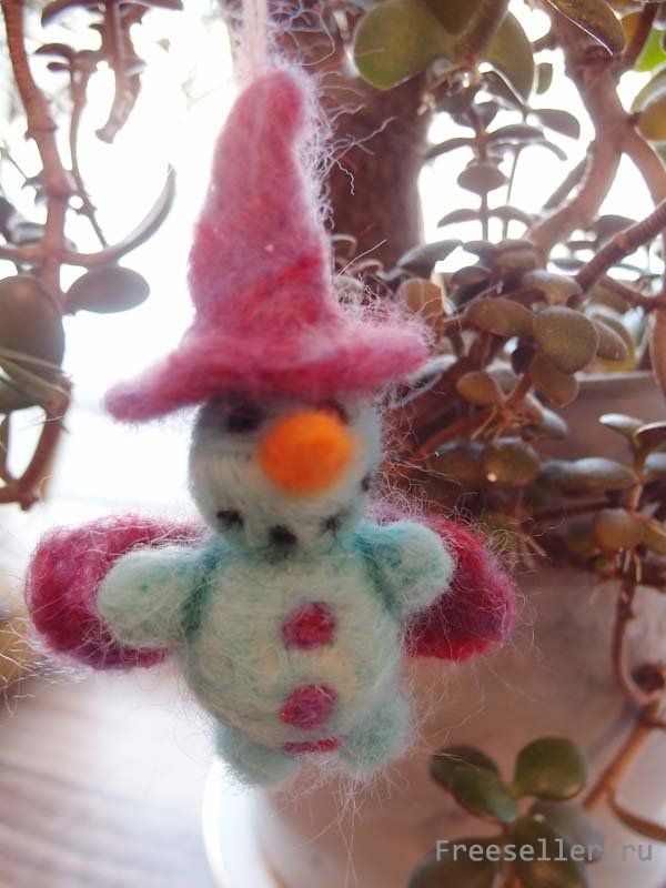 У нас всё готово) остаётся лишь собрать игрушку. Руки, крылья, шарфик мы прибиваем иглой. А голову, туловище и головной убор закрепляем ниткой, продев её через туловище, голову и шляпу. Продев нить делаем узелок и сразу петельку, за которую мы повесим игрушку на ёлку.