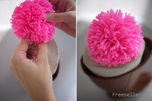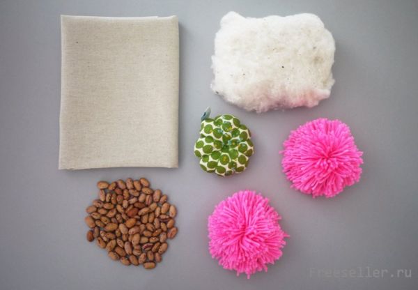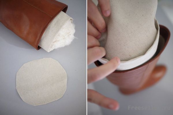 Из ткани, которая осталась лишней вырежьте овалы, для шапки трубу. Положите его на верхней части.