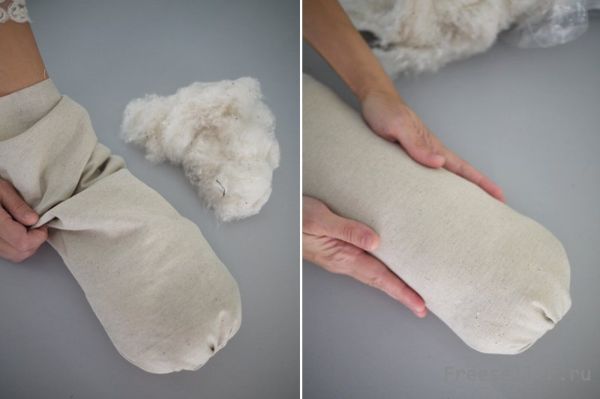 Когда труба будет заполнена, добавьте вату и обрежьте лишнюю ткань.