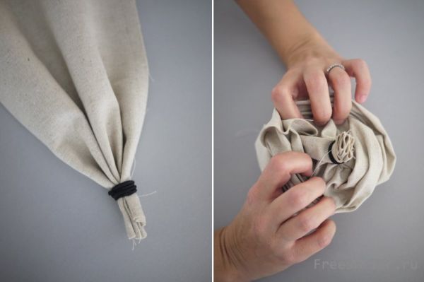 Край ткани, который свернут гармошкой, связываем шнурком либо резинкой. Поворачиваем трубу изнутри.