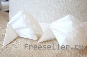 Сложите каждую бумажную формочку в четыре раза и согните пополам, как показано на рисунке. Конечно, будет лучше, если вы заготовите всю пачку заранее перед приклеиванием формочек на абажур.