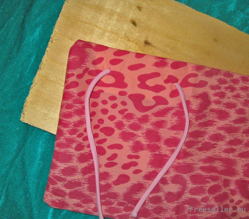 5 - продеваем через картонки шнурки, вставляем картонки вовнутрь мешочка и протягиваем шнурки через ткань наружу, затем вставляем фанерку;