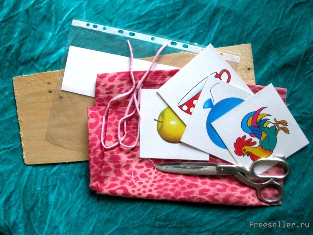 2 - вырезаем из сложенной вдвое ткани прямоугольник по размеру фанерки с припуском на шов (размер фанеры определяется размером карточек и количеством их групп);