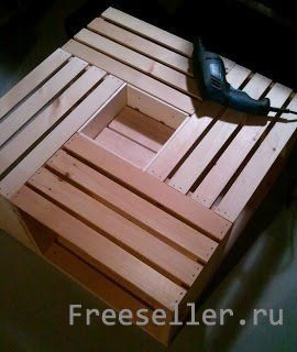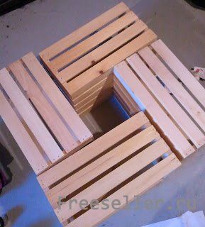 Четыре ящика необходимо стянуть саморезами. Перевернув конструкцию вверх дном, необходимо закрыть центрально отверстие используя обрезки досок, как показано на фотографии (для удобства лучше использовать мебельные уголки):